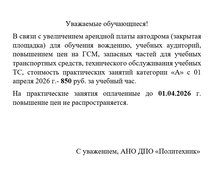Увеличение стоимости оплаты обучения с 01.04.2026 г.